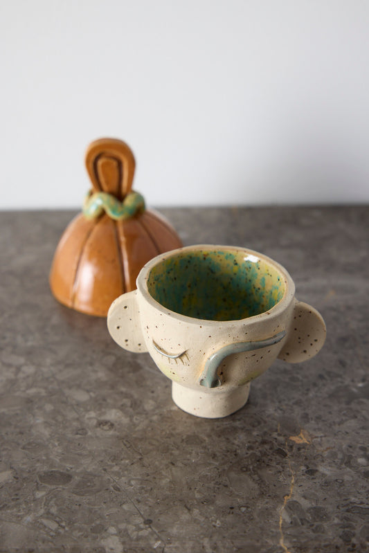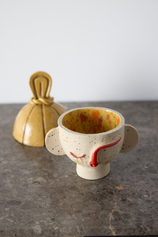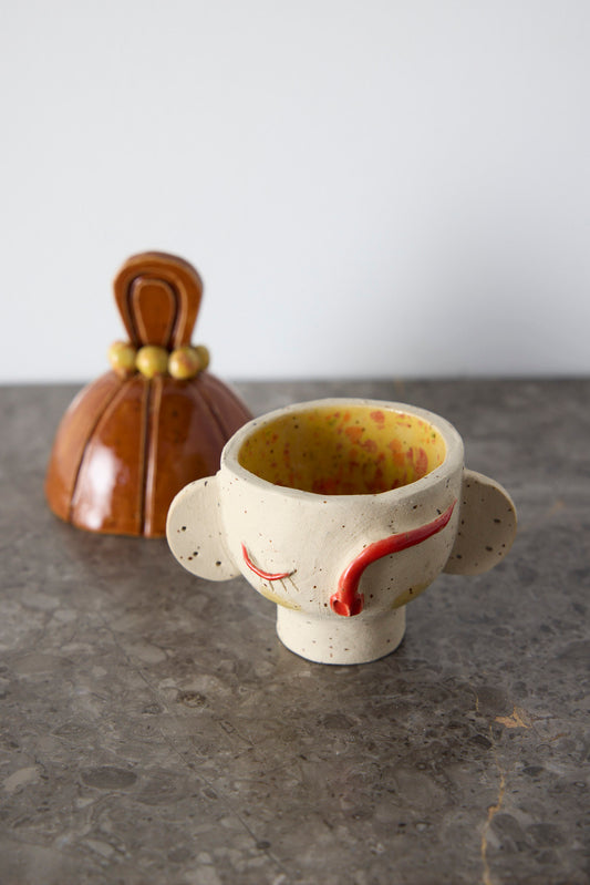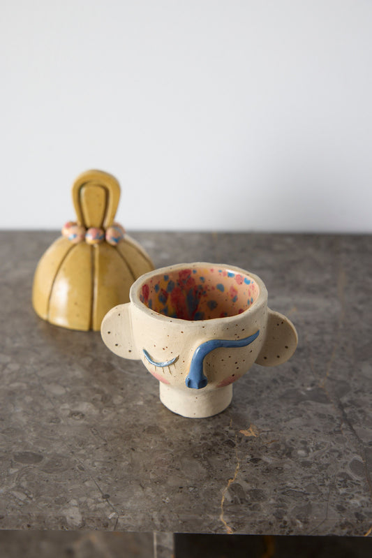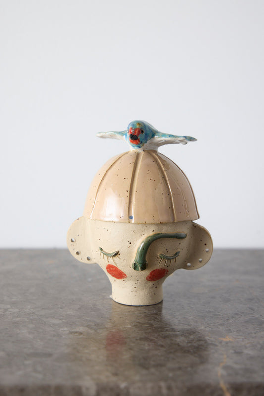 Galleri Lou Ra repræsenterer Hulda Rún som med sit keramiske univers ønsker at berige både dit sind og hjem. Hulda Rún skaber med hjertet og formidler en kærlighed til det skæve og finurlige keramik som giver seeren et smil på læben.