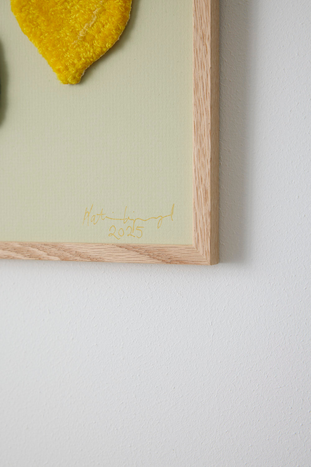 Indrammet på lysegul bagplade i egetræsramme (uden glas)