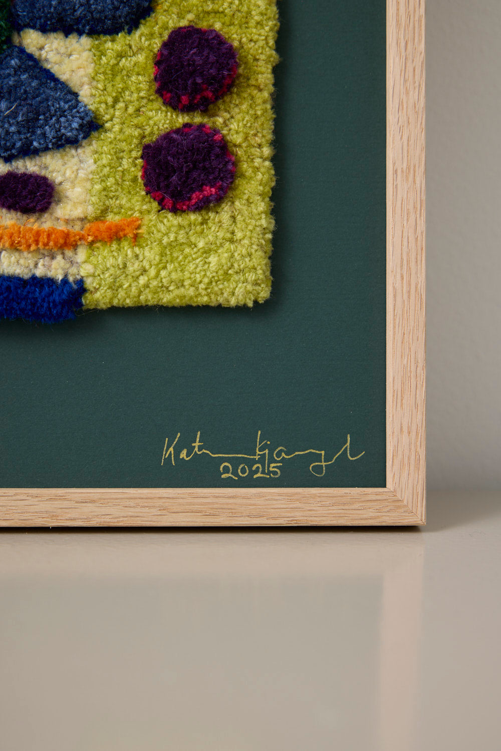 Indrammet i massiv træramme på mørkegrøn træplade uden glas.