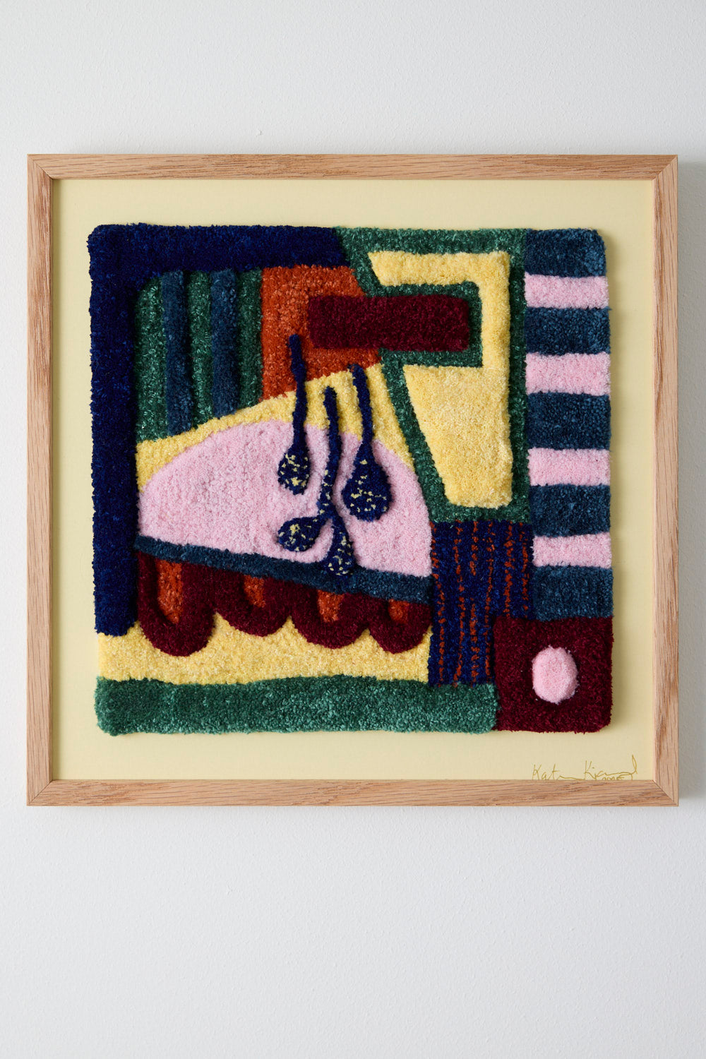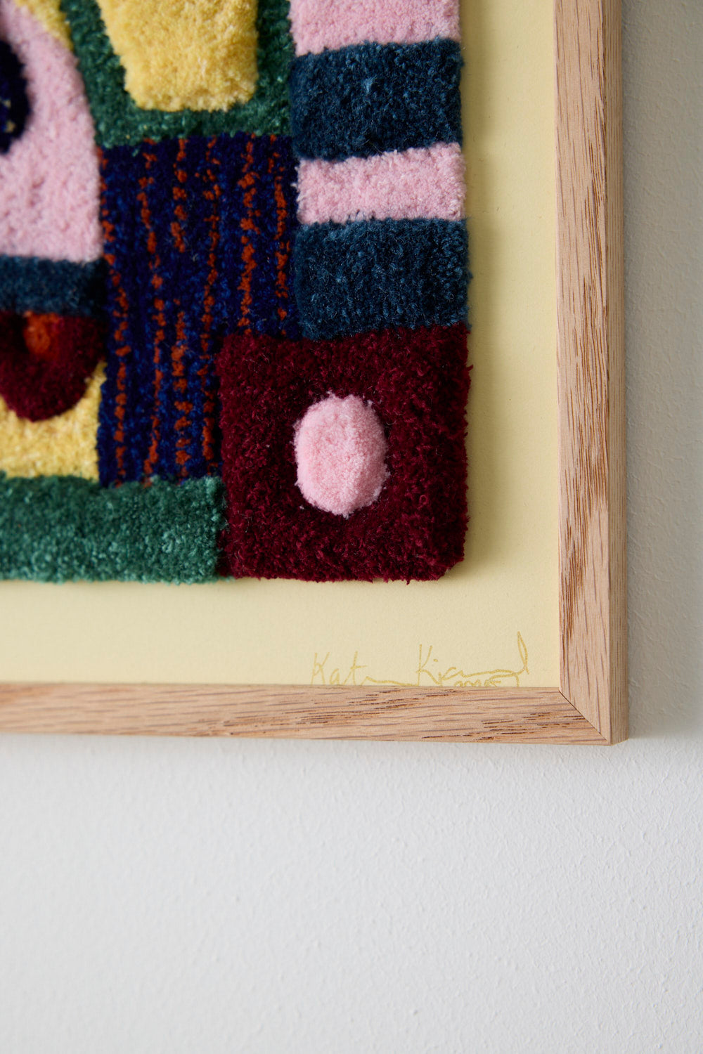 Indrammet på lysegul bagplade i egetræsramme (uden glas)